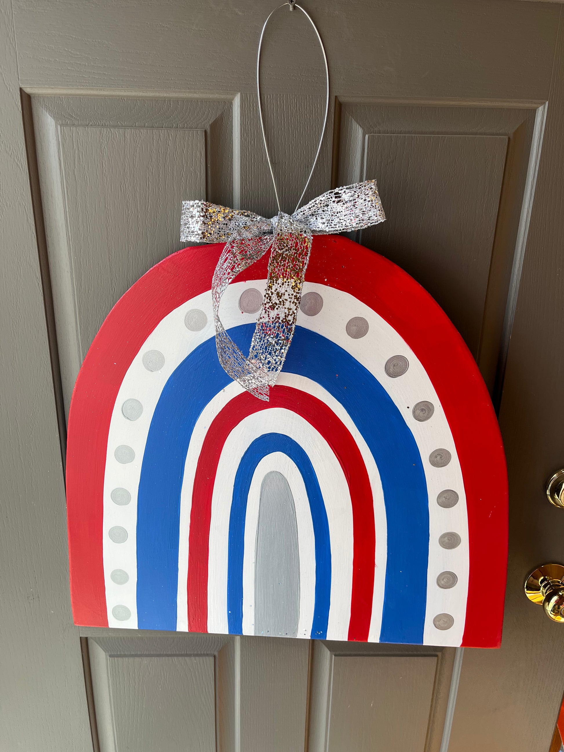 Rainbow in red, white, blue and silver.
